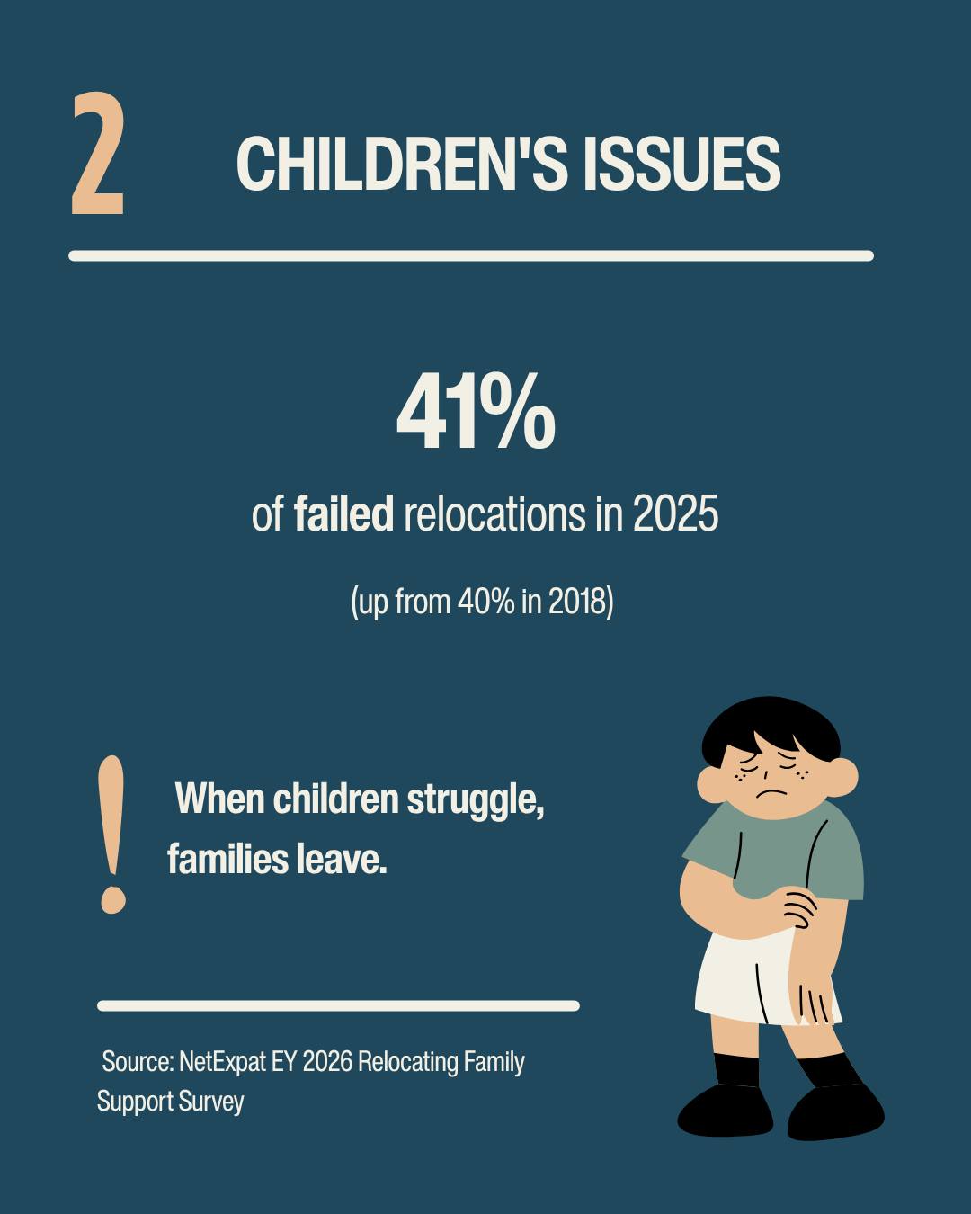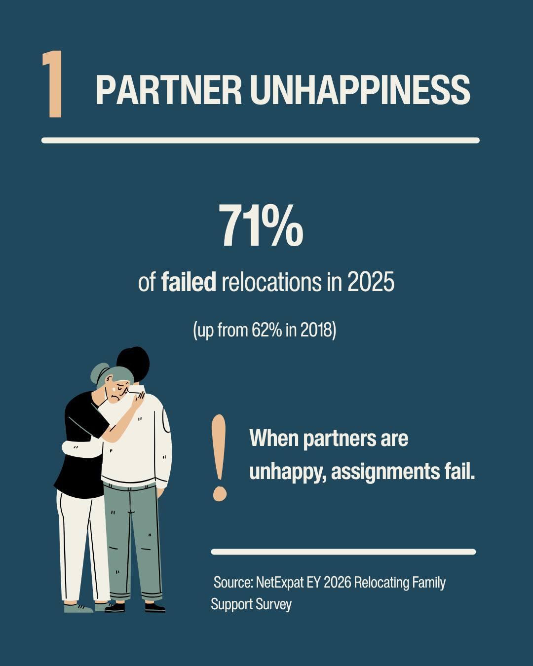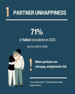 According to the NetExpat EY 2026 Relocating Family Support Survey, 71% of failed relocations involve unhappy partners. 41% involve children's issues.