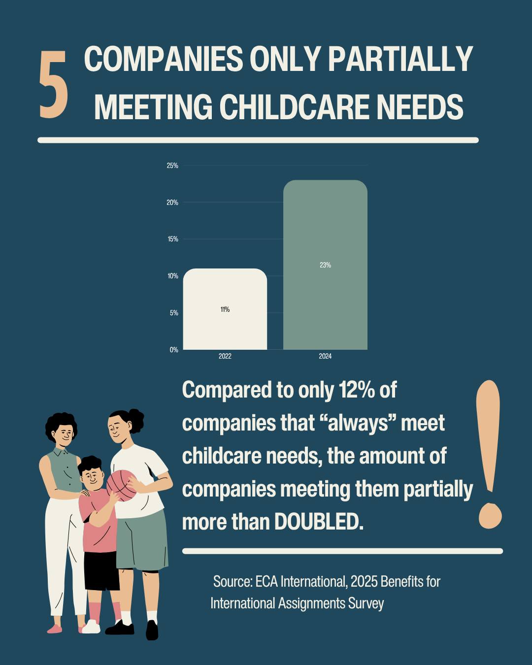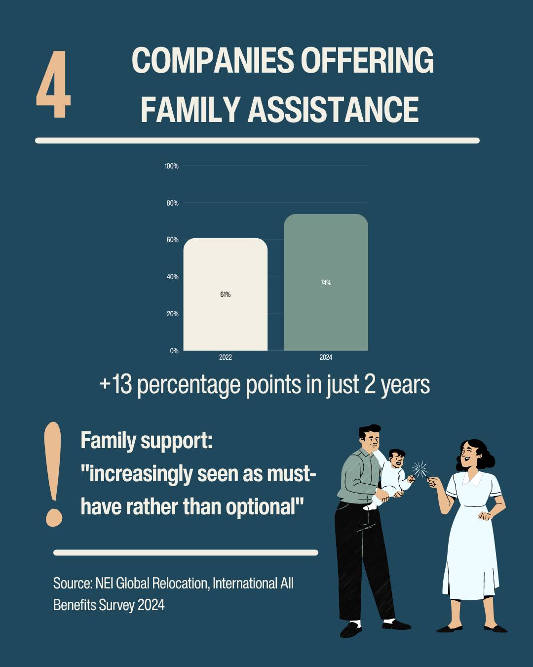 And companies are responding—family assistance up from 61% (2022) to 74% (2024), the NEI Global Relocation’s International All Benefits Survey of 108 global companies’ policies suggests. ECA International’s 2025 Benefits Survey found that childcare support doubled from 11% to 23%.
